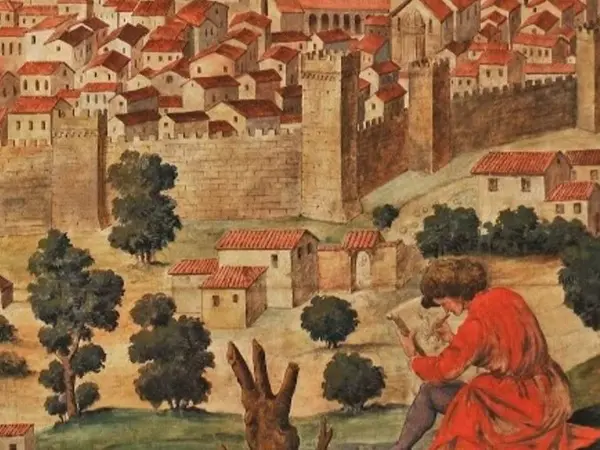 Dankzij zijn positie kunnen we vrij gemakkelijk het standpunt bepalen van waaruit de kaart is opgetekend, namelijk ten noordwesten van de stad, ter hoogte van de klokkentoren van het Monastero di Monteoliveto.