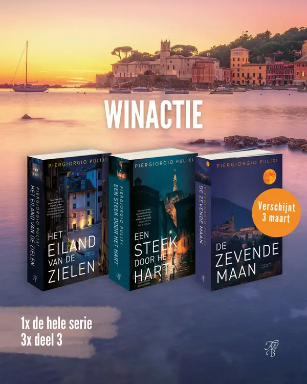 Namens A.W. Bruna Uitgevers mogen we drie lezers blij maken met De zevende maan. Ook mogen we één lezer trakteren op de drie tot nu toe in het Nederlands vertaalde boeken van Pulixi: Het eiland van de zielen, Een steek door het hart en De zevende maan.