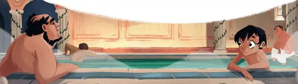 Meester Marcus haalt zijn schouders op en loopt in zijn eentje naar het koudwaterbad. Hij geeft zijn leerling een waarschuwing: ‘Titus, maak de senator niet boos! En vergeet niet dat je vandaag nog een deel van je toets hebt. Moge de goden je helpen!’