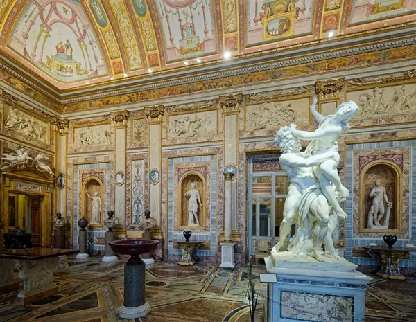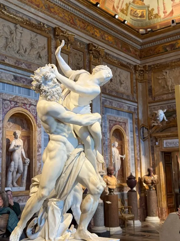 In het midden van de ruimte staat een beeld gemaakt door Bernini. Een beeld dat gaat over de mythe van Proserpina en Pluto. Vanaf de sokkel torent het hoog boven ons uit. De tourguide vertelt over hoe Proserpina op een dag wordt ontvoerd door Pluto, god van de onderwereld. Tevens is Pluto de broer van Jupiter en Jupiter is de koning van de goden en god van de hemel.