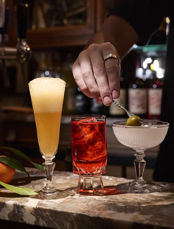 Bij deze heerlijke pallotte di cacio e pepe drink je een Cardinale (op de foto hieronder geflankeerd door een Bellini en een Martini), die zijn oorsprong in Rome vindt, waar het drankje rond 1950 is ontstaan.