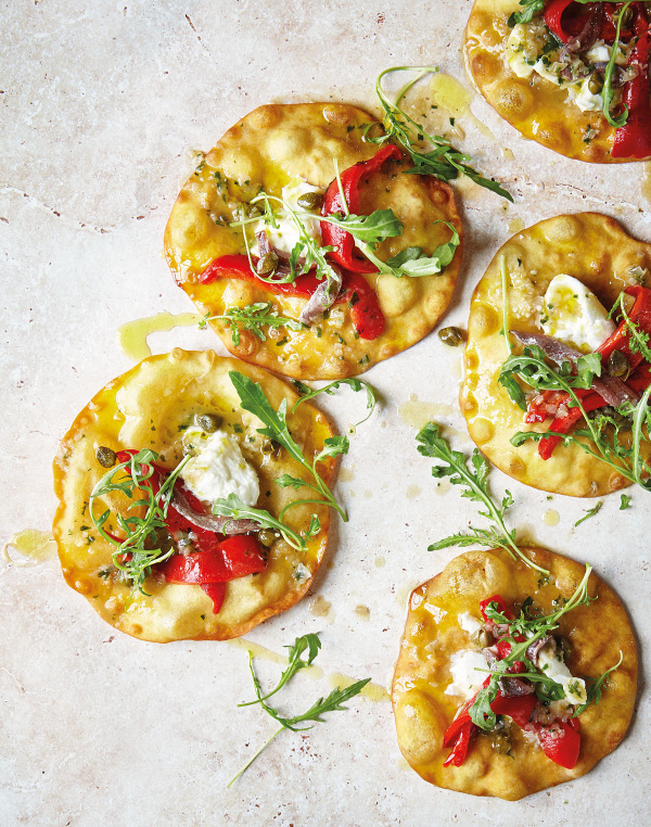 Leg op de bedekte bakplaat en bak tien tot twaalf minuten in een voorverwarmde oven. Haal uit de oven, vouw het blaadje open zodat de mozzarella zichtbaar wordt en garneer eventueel met citroenrasp. Zalig met goede olijfolie en brood.