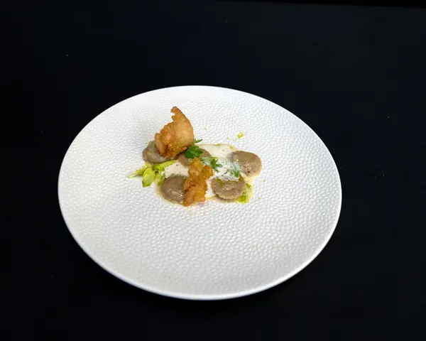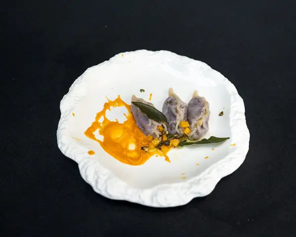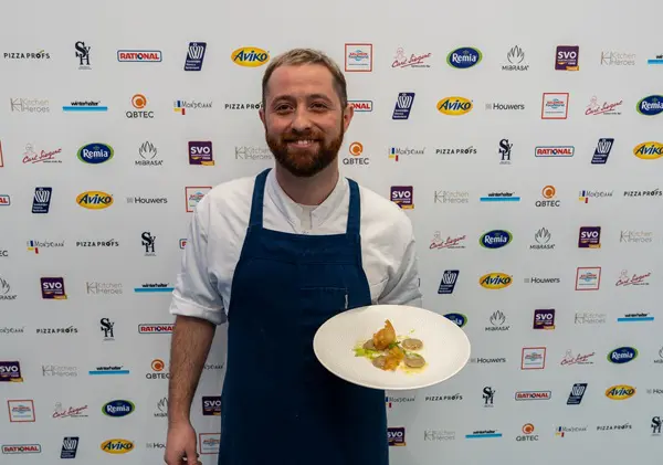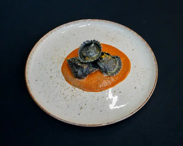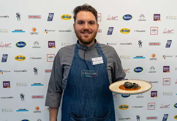 De tweede plek is voor Christopher Sessa van Ristorante Il Boccone in Arnhem. Hij serveert zijn tortello al nero, zwarte ravioli gevuld met onder andere aardappel, gerookte kabeljauw en dille, op een gambabisque.