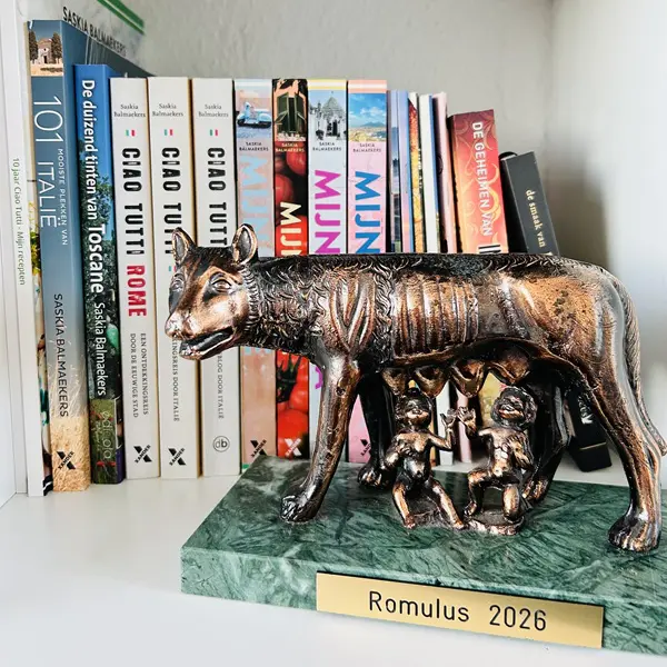 Inmiddels waakt de wolvin op het plankje met Saskia’s boeken in Ciao tutti’s bibliotheek. Overigens krijgt ze als winnaar van de Romulusprijs ook een levenslang lidmaatschap van S.P.Q.R., dat naast een interessante wekelijkse nieuwsbrief toegang geeft tot alle S.P.Q.R.-lezingen en bijeenkomsten. Saskia heeft beloofd om tussen haar reizen naar Italië door ook af en toe een lezing te geven in Leuven.
