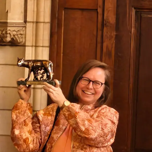 Afgelopen week was het feest. Niet alleen omdat Rome op 21 april haar 2779ste verjaardag vierde, maar ook omdat Saskia op die dag in Leuven van S.P.Q.R. de Romulusprijs kreeg uitgereikt, een duplicaat van het wereldberoemde beeld van de Romeinse wolvin met Romulus en Remus.
