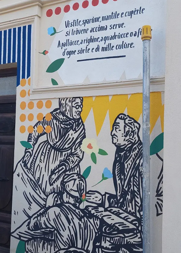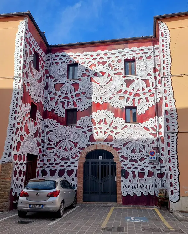 Veel van de kunstwerken verwijzen naar een oud ambacht van het dorp. Zo wordt een van de huizen geheel bedekt door een schildering van traditioneel kant uit Abruzzo.