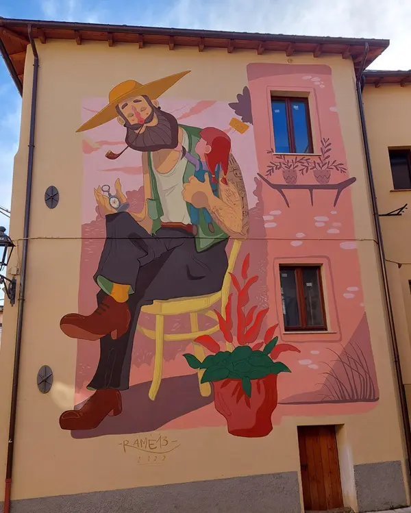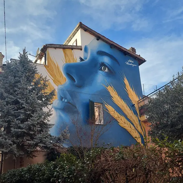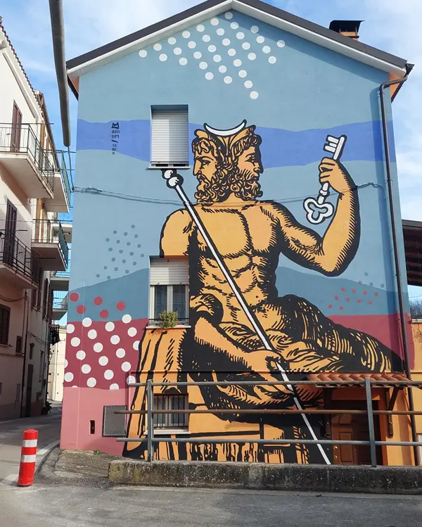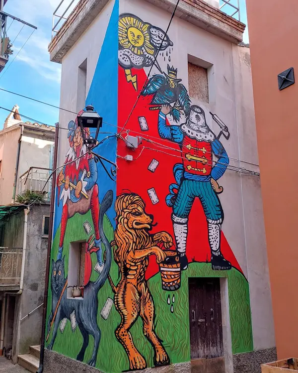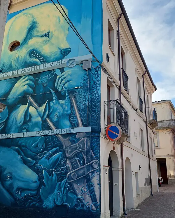 Als je door de smalle straatjes wandelt, vallen de schilderingen op muren en deuren meteen op. Een groep jongeren uit Bisenti besloot dat het dorp wel wat levendigheid kon gebruiken en heeft samen met de gemeente kunstenaars uit verschillende dorpen in de regio gevraagd om hier te komen schilderen.