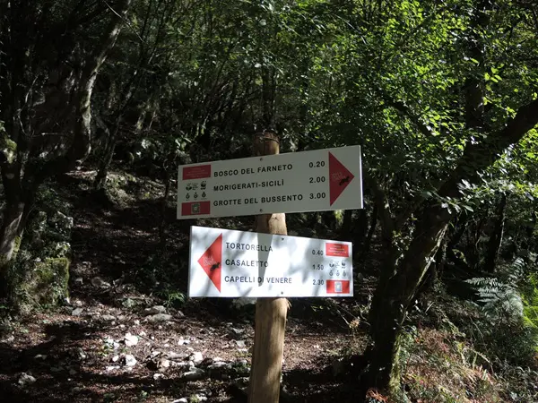 Vanuit Tortorella daalt een pad met mooie vergezichten af naar een riviertje dat ’s zomers droog staat. Over stapstenen steek je het riviertje over naar het Bosco del Farneto, waarna je het bos volgt richting Morigerati, het volgende hooggelegen dorpje bij een kloof in de rivier. In de herfst is het bos begroeid met wilde cyclamen.