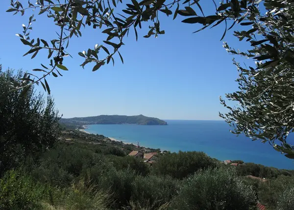 Links zie je de zee bij de Golf van Policastro en rechts de Kaap van Palinuro, het einddoel van de Cammino di San Nilo.