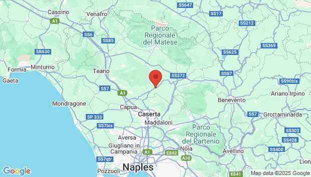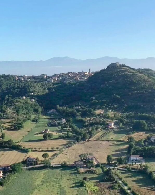Vanaf het terras zie je het Longobardische kasteel met de Torre Aragonese, de klokkentoren en de koepel van de San Pietro, de vallei met de rivier Volturno en de Monti Tifatini.