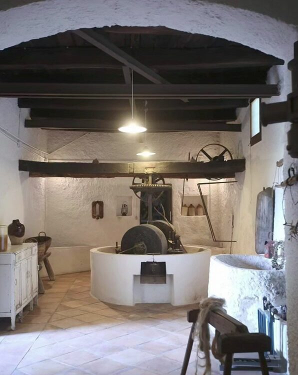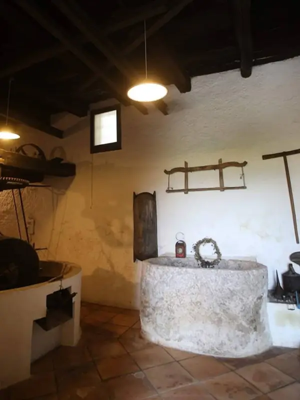 De molen werd vroeger door ezels aangedreven. Indrukwekkend zijn de met de hand uitgehouwen stenen bak en de gietijzeren pers. Achter in de ruimte bevindt zich een prachtige keuken met oven en warmhoudplaat, allemaal in oorspronkelijke staat teruggebracht.