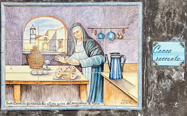 Tegenwoordig is het klooster omgetoverd tot een luxe hotel, waar nog altijd sfogliatelle worden geserveerd. Buiten vind je een mooi aandenken in keramiek aan de eerste gebakjes.