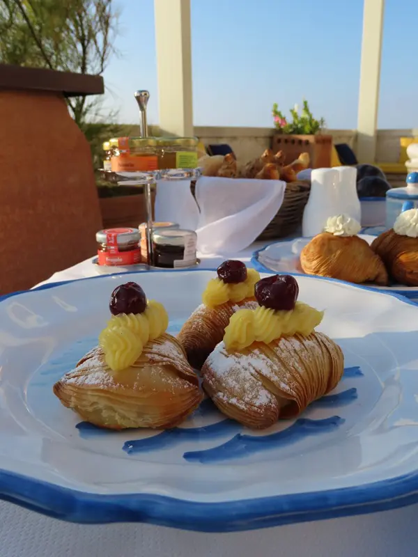 De Napolitanen zijn dol op deze prachtig geschulpte lekkernij van dun bladerdeeg, gevuld met ricotta, gekonfijte citroen- en sinaasappelschil, vanille en een vleugje kaneel. Je eet deze deegschelp het liefst als ‘ie nog lekker warm is, bestrooid met wat poedersuiker. Het is – samen met een cappuccino of caffè – een prima start van de dag, waar je heel wat kilometers op kunt teren.