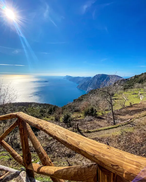 Aan de ene kant kijk je over de gemeente Agerola, tot ver in de Cilento, terwijl aan de andere kant het groene heuvelachtige terrein zich uitstrekt naar Punta Campanella.