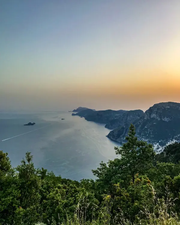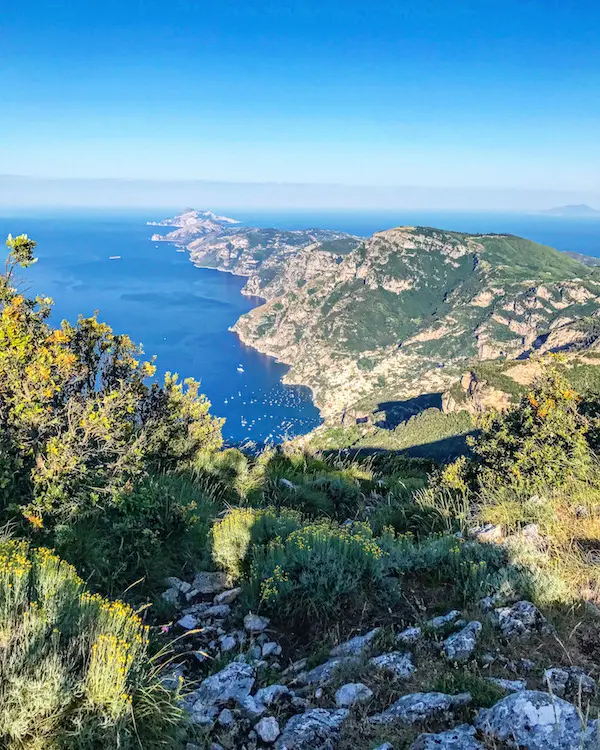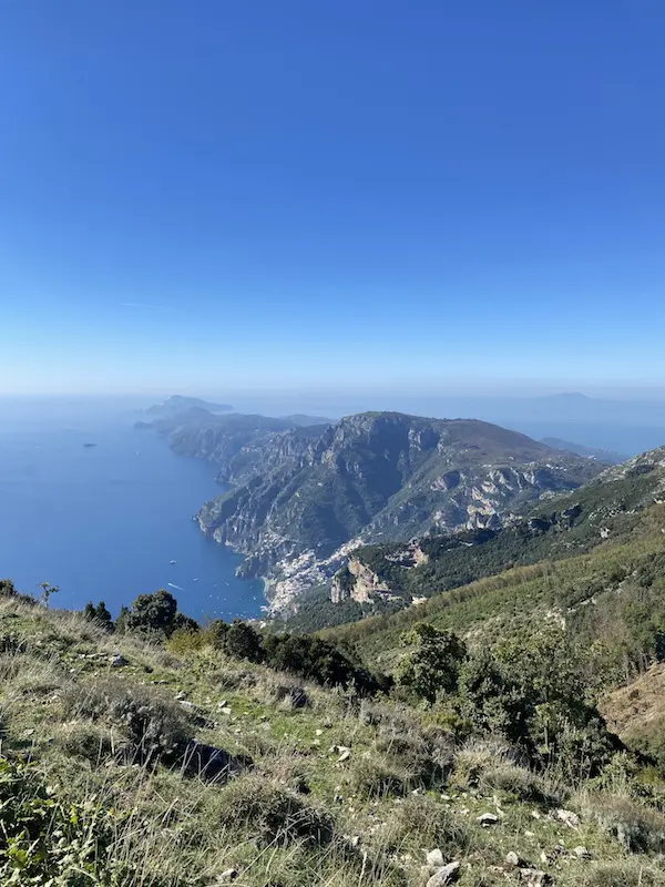 Direct daarachter ontvouwt zich een weids uitzicht op de kust. In de verte zijn de karakteristieke, op elkaar gebouwde huizen van Positano te zien, waarna het heuvelachtige en rotsachtige landschap doorloopt tot aan Punta Campanella, het uiterste puntje van het Sorrentijns schiereiland.