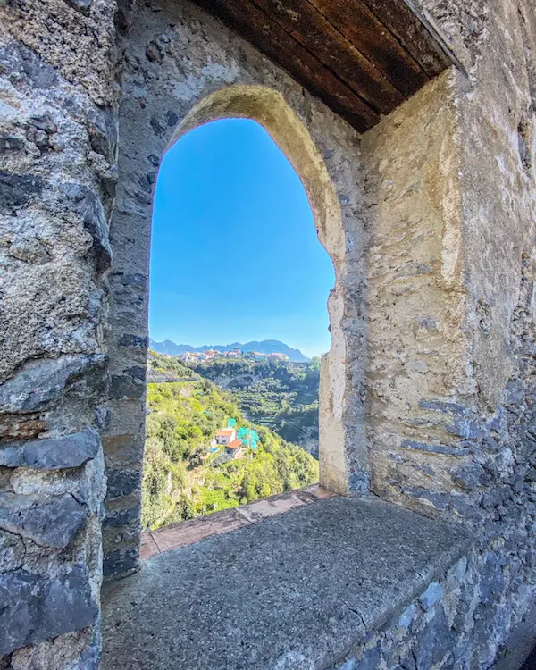 De strategische locatie van de basiliek is geen toeval: vanaf hier kijk je uit over de Valle del Dragone, met aan de overkant het silhouet van Ravello en de glinsterende zee in de verte.