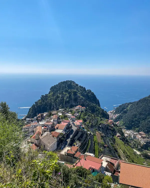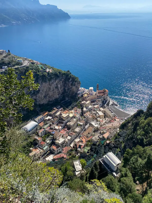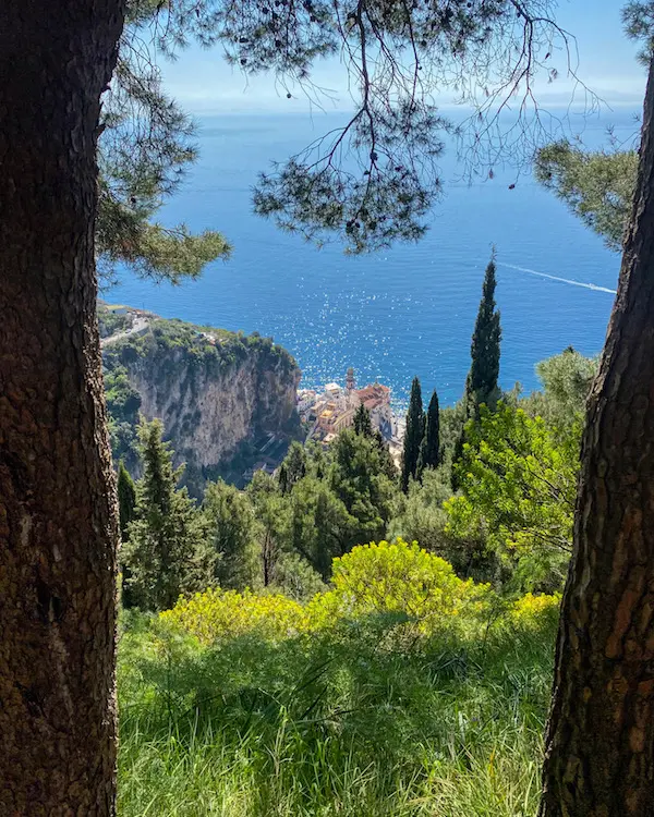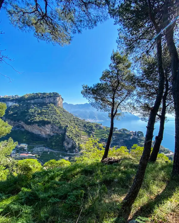 De route wordt duidelijk aangegeven en voert je via een lange trap omhoog, door een rustige, groene omgeving. Onderweg zie je Ravello opduiken in de verte, met het iconische Terrazza dell’Infinito van Villa Cimbrone, en kun je een glimp opvangen van Atrani.