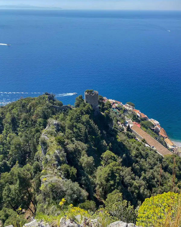 Hier heb je een prachtig uitzicht op de toren, verstopt tussen het groen. Aan de ene kant zie je Atrani liggen, met het doolhof van steegjes tussen de huisjes, en aan de andere kant kijk je uit over Amalfi. Het is een geweldig plekje dat voor veel bezoekers van de Amalfikust onbekend terrein blijft, waardoor je alle pracht van het gebied in stilte in je op kunt nemen.