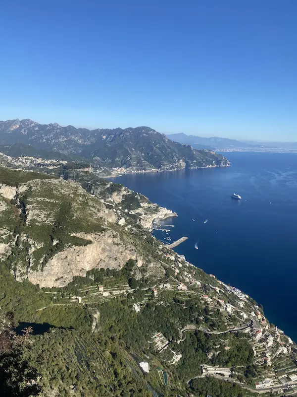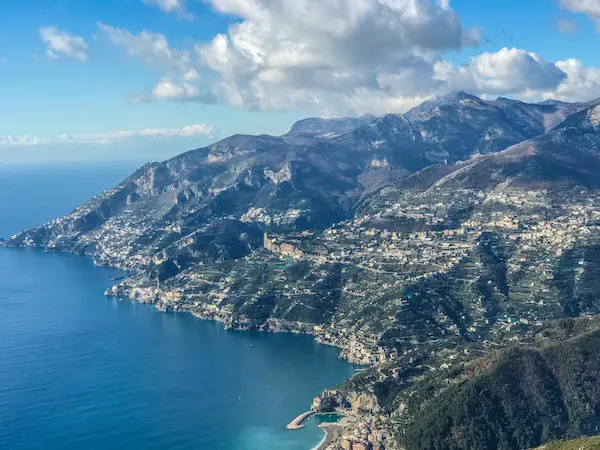 Vanaf dit uitkijkpunt rollen de terrassen van de Amalfikust zich onder je voeten uit. Je herkent vast de bekendste plekken: Amalfi met de beroemde kathedraal en iets verderop Ravello met het beroemde terras van Villa Cimbrone.