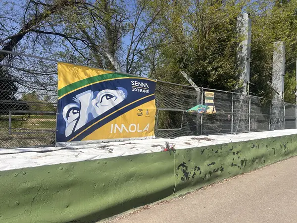 Weer in het busje wijst Chiara de Tamburello-bocht aan, waar Ayrton Senna in 1994 de macht over het stuur verloor. We stoppen waar zijn wagen uiteindelijk tot stilstand kwam.