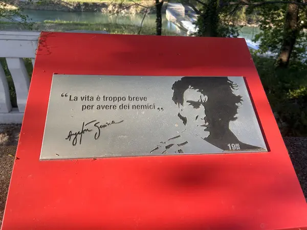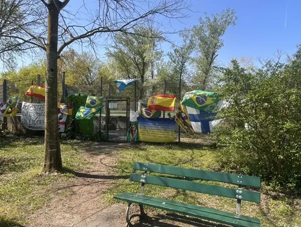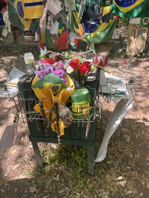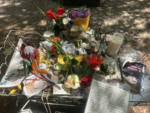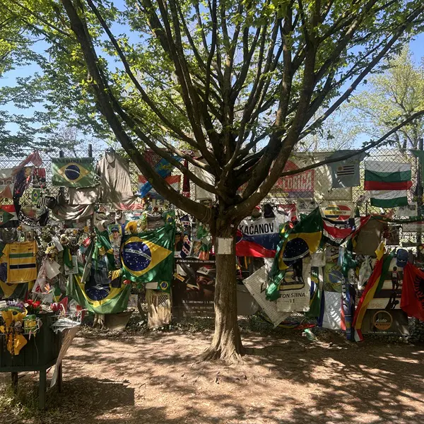De hekken zijn behangen met vlaggen, shirts, brieven… Van over de hele wereld komen er nog dagelijks fans. Eenmaal bij het standbeeld aangekomen voel ik een andere sfeer. Hoeveel vrolijke kleur hier ook is onder de bomen, er heerst stilte. Er staan bankjes, mensen lijken te bidden.