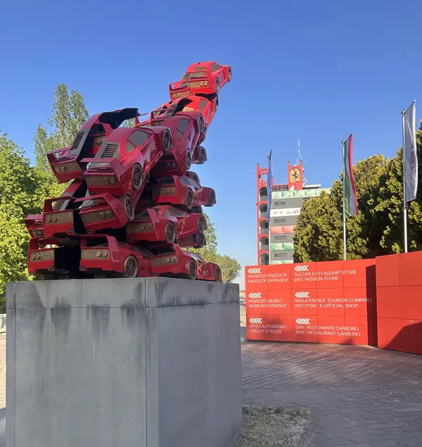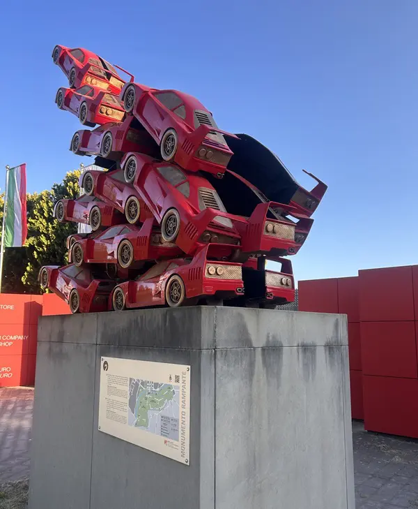 Het eveneens rode monument met de naam Rampante is een vijf meter hoog kunstwerk bestaande uit opgestapelde bronzen replica’s van de Ferrari F40, een eerbetoon aan deze klassieker uit Maranello.