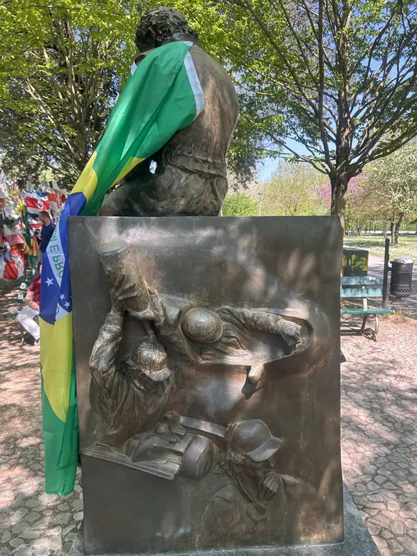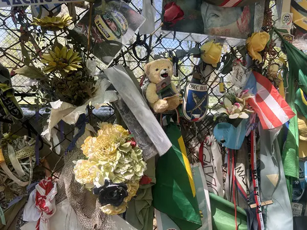 Het beeld van Senna is indrukwekkend. Je kunt er omheen lopen en elke zijde biedt een ander tafereel. Er is een soort altaartje waar uiteenlopende dingen zijn neergelegd of opgehangen. Ik zie gedichtjes, kaarsen, bloemen, steentjes, beertjes.
