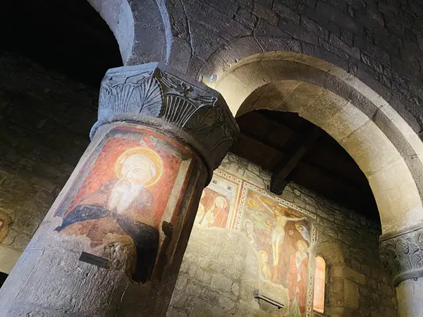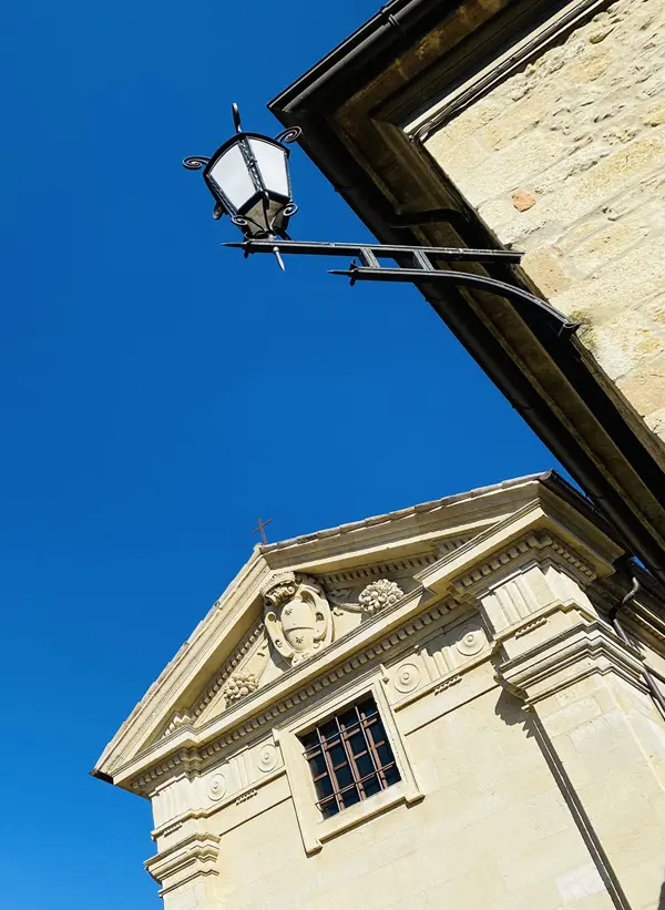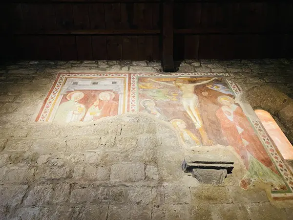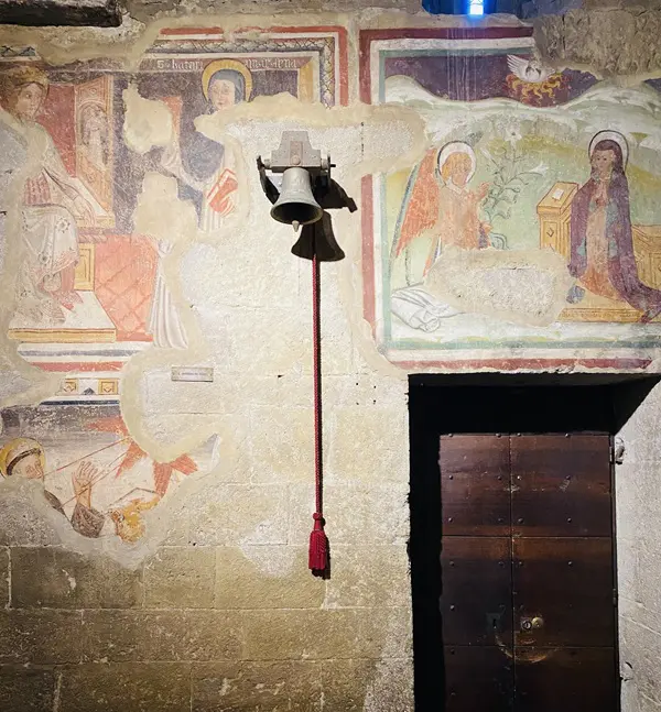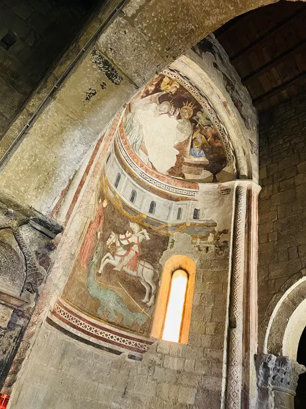 Je wordt verwelkomd door een lunet van Sint-Joris boven de deur. Binnen bewonder je bijzonder mooie middeleeuwse fresco’s, onder meer van Joris die de draak doodt en de prinses weet te bevrijden.