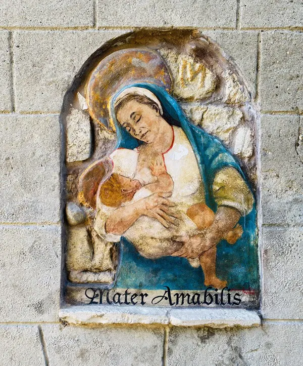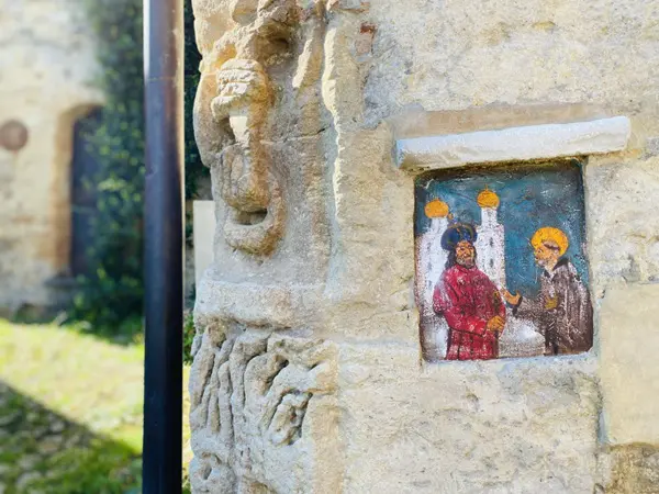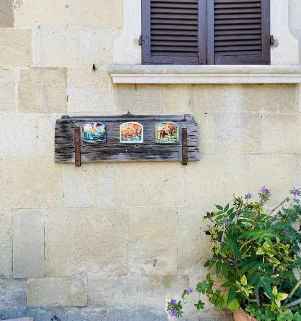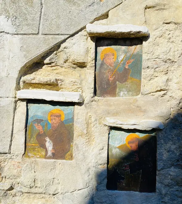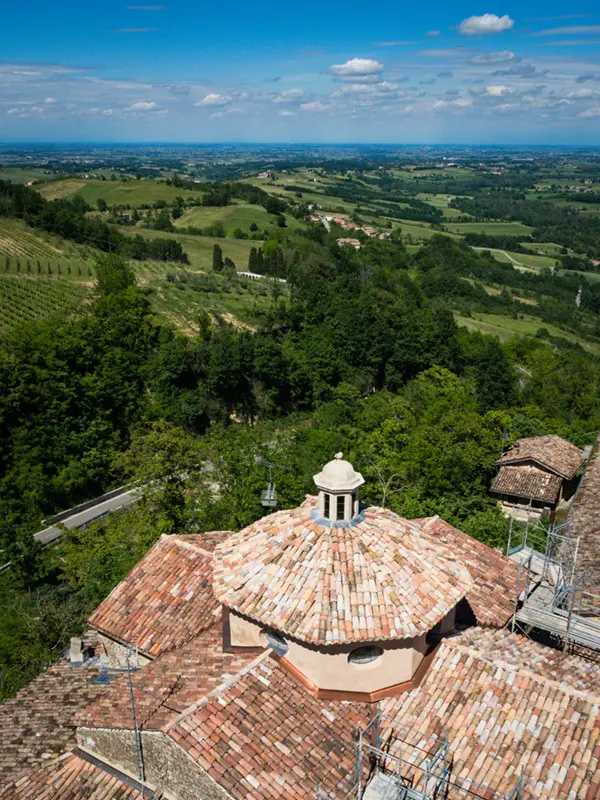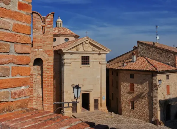 Als je geluk hebt, staan ook de deuren van dit heiligdom open. Het werd in de zestiende eeuw gebouwd op de fundamenten van een pleisterplaats voor pelgrims en kooplieden op doorreis, zoals blijkt uit de afbeelding van San Rocco aan de rechterzijde, een van de oudste basreliëfs van Vigoleno.