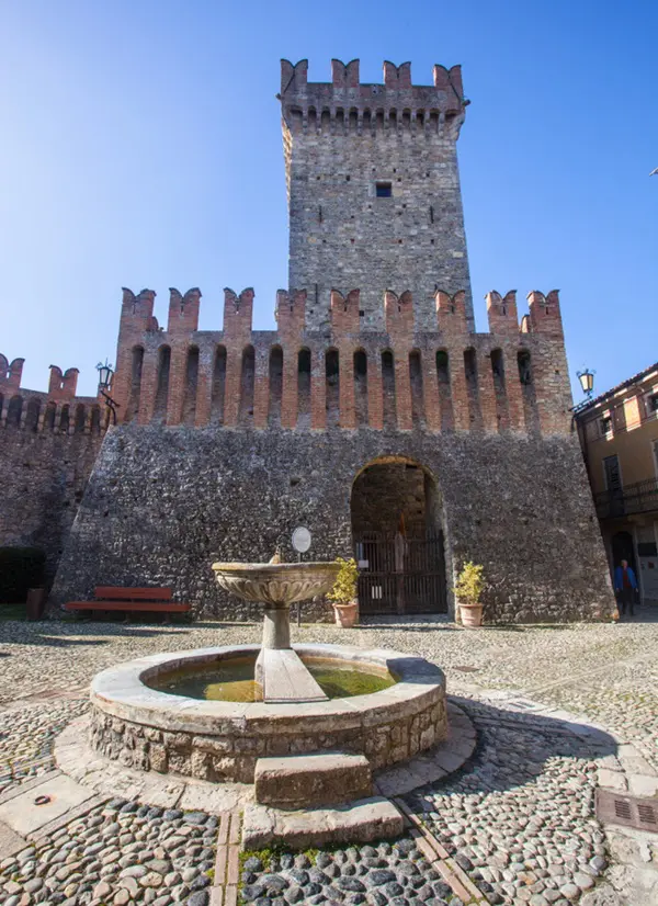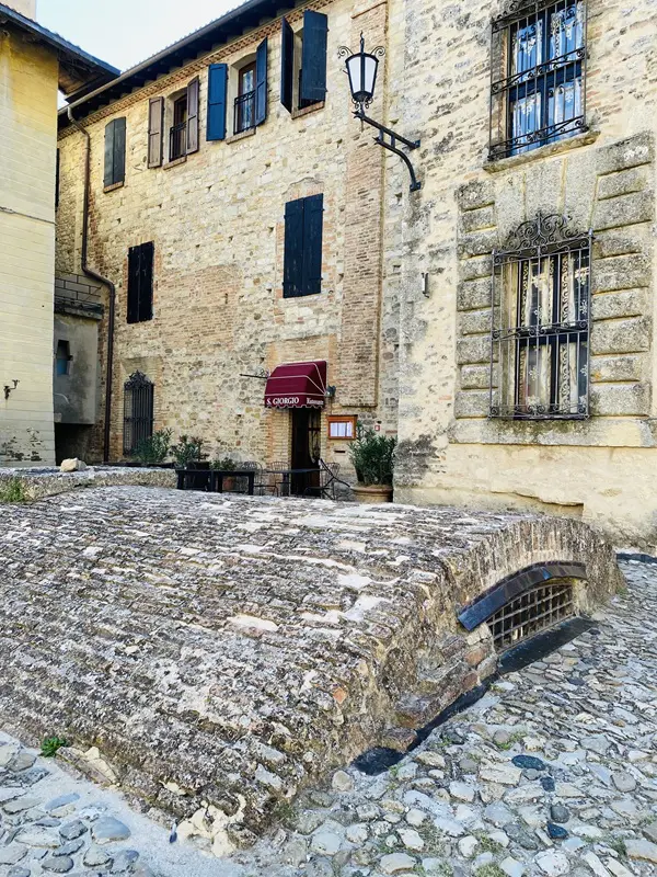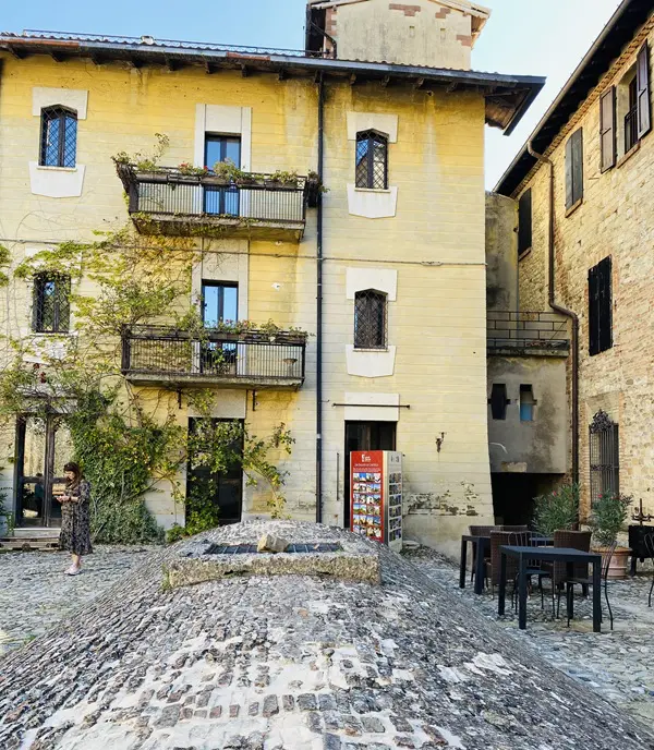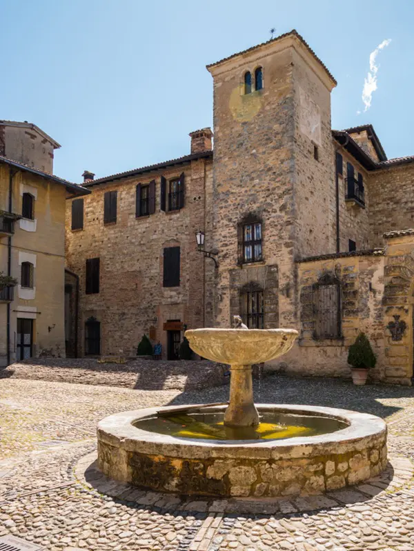 Op het centrale plein van Vigoleno staat een zestiende-eeuwse fontein, omringd door elegante historische gebouwen die in schril contrast staan met de ietwat grimmige verdedigingsmuren die de wereld buitensluiten.
