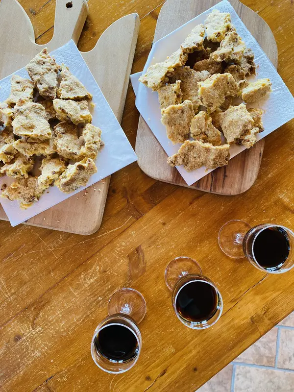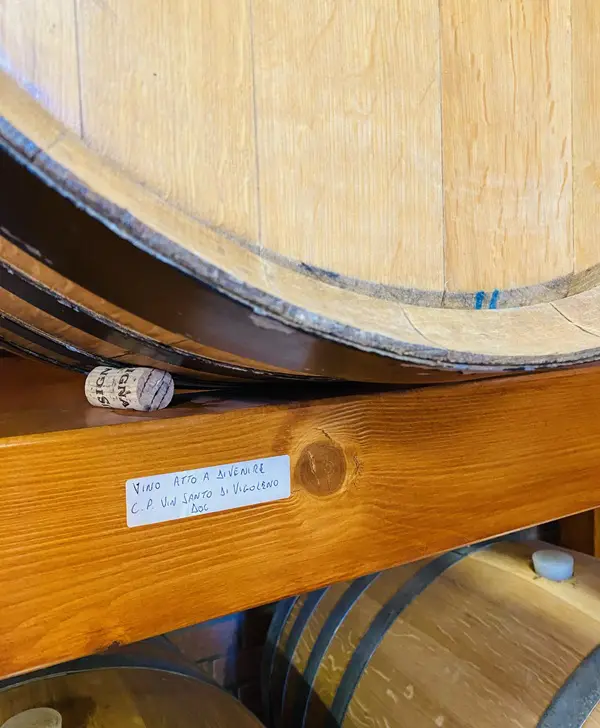 Terwijl Marco Lusignani de glaasjes voor ons vol schenkt, serveert zijn moeder er versgebakken sbrisolona en stukjes kaas bij. Beide perfecte combinaties met de heilige wijn!