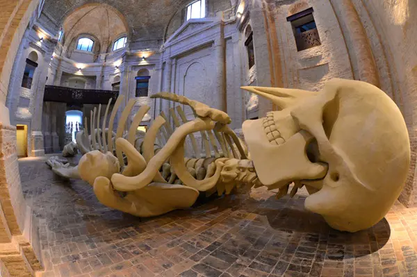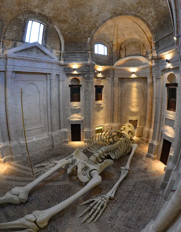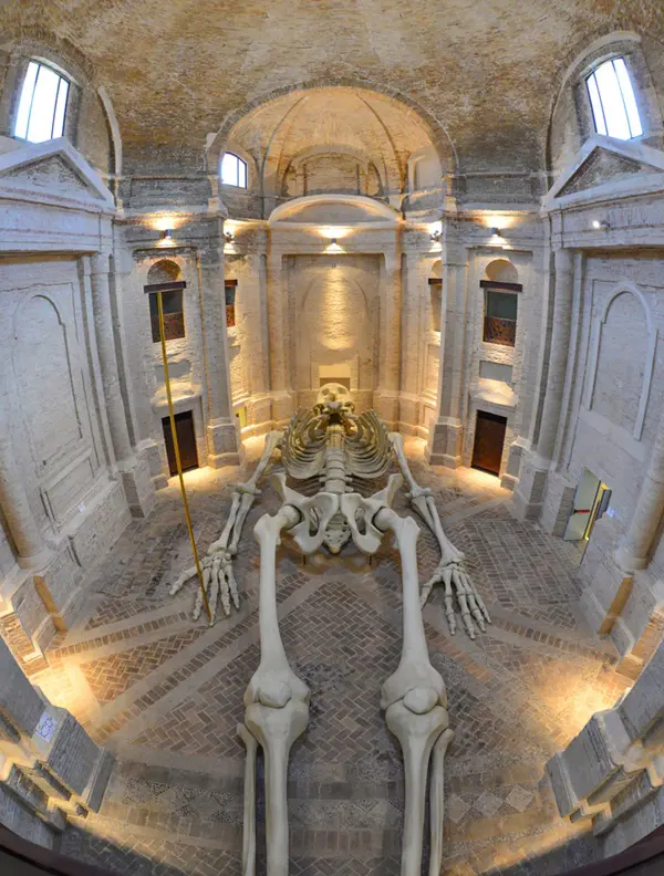 In de voormalige Chiesa dell’Annunziata in Foligno bewonder je een gigantisch skelet van de hand van Gino De Dominicis uit Ancona. De kunstenaar wilde spelen met de associaties met de dood die inherent zijn aan het beeld van een skelet, door een geraamte van zulke immense proporties te creëren dat het onmogelijk te vermijden is.