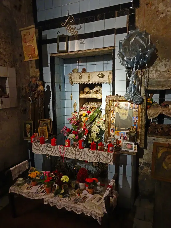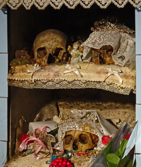Daarom wreven de Napolitanen de schedels mooi op, plaatsten ze op een kussentje of in een houten kapelletje en versierden ze met bloemen, rozenkransen en fotootjes van overleden familieleden. Ze kwamen geregeld even langs, om een kaarsje op te steken en te bidden, met oneindig veel dankbetuigingen als een gebed werd verhoord.