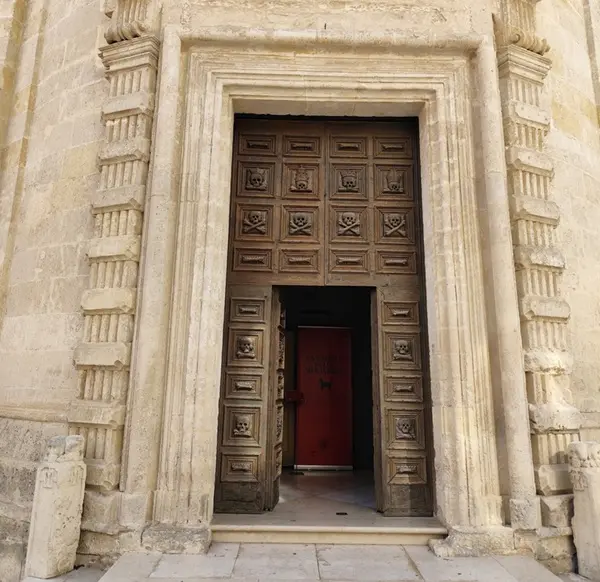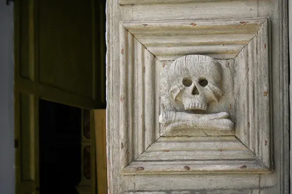 De houten deur is verdeeld in zesendertig vierkanten en versierd met schedels en botten van edelen, geestelijken en gewone stervelingen. Daarboven staan twee skeletten, één met een zeis en één met een zandloper, naast een embleem met een schedel en een persoon die verteerd wordt door de vlammen. Ook boven de zijdeuren zijn schedels te zien.