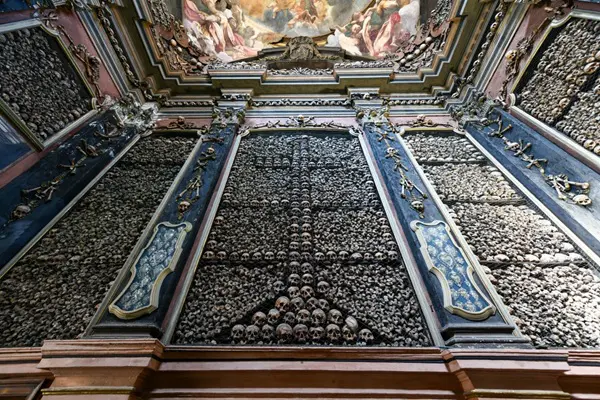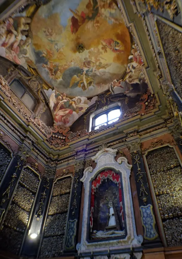 Of eigenlijk kun je beter zeggen mét deze botten. Alle schedels, dijbenen, ruggenwervels en kuitbenen kregen namelijk een plek in de kapel – iets wat je als bezoeker nog altijd kunt zien. Je staat letterlijk oog in oog met de schedels, onder een door Sebastiano Ricci prachtig beschilderd frescoplafond.