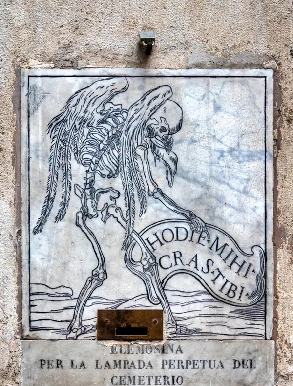 Op een inscriptie lees je de macabere woorden: ‘Wat jij bent, waren wij. Wat wij zijn, zul jij zijn’. Een dubbelzinnige boodschap gezien het verleden van deze straat – dat ook roem vergankelijk is, daar weet de Via Veneto alles van.
