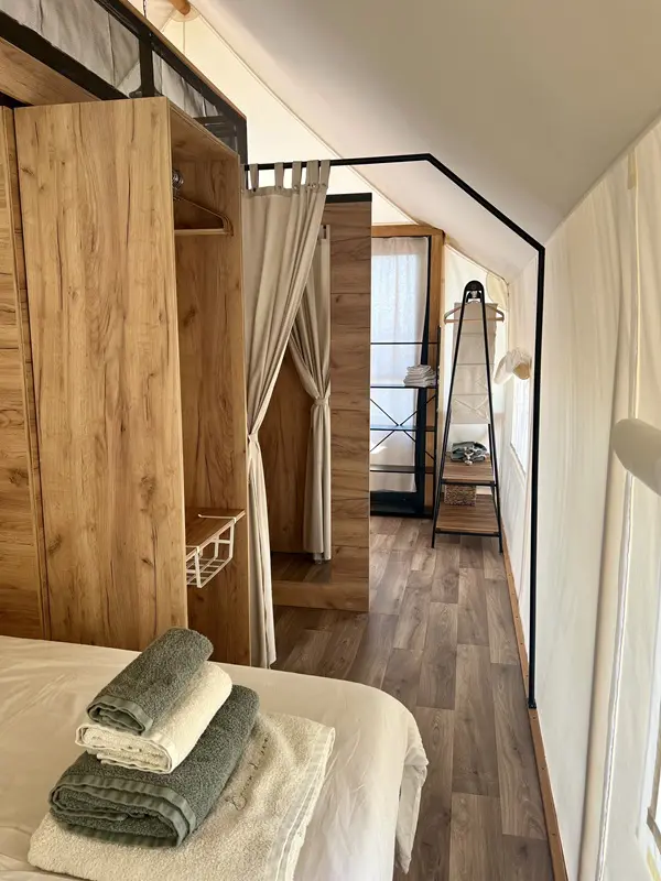 De tenten zijn uitgerust met airco, terwijl een schuifraam prachtig uitzicht over de wijngaard en de omgeving biedt.