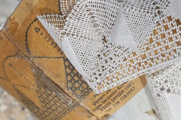 Aangezien ik nieuwsgierig ben naar hoe haar passie voor het kantklossen ooit begonnen is, legt Marisa me uit: ‘Ik kom uit een famiglia di contadini, een boerenfamilie. Het kantklossen hebben we allemaal geleerd van onze moeders, tantes, oma’s en buurvrouwen.