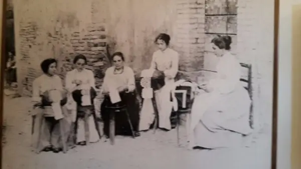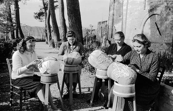 Tussen het werken op het land en in huis door, zaten we ‘s zomers in de schaduw van de grote bomen te kantklossen. We gebruikten simpele, zelfgemaakte hulpmiddelen: een groot oud blik van gezouten sardines kreeg houten stokken als poten en daar legden we een slaapkussen op dat we hadden omgetoverd tot kantkloskussen, volgepropt met wijnrankbladen. De klosjes maakten we van oude wijnranken. Zo leerden we de techniek en maakten we onze eerste kantwerkjes.