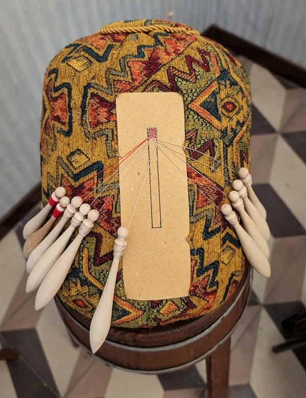 Marisa legt uit hoe het werkt. ‘Eerst kies je een ontwerp: een zelfgemaakte of gekochte tekening die op stevig papier gezet wordt. Dit patroon moet dan vastgespeld worden op de tombolo.