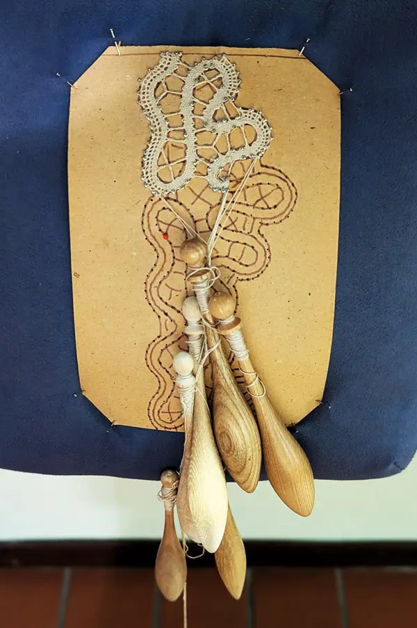 Ik vraag haar hoe dat komt, en Vania vertelt over hoe het vroeger was. ‘Het kantklossen was onze ontspanning,’ zegt ze. ‘Toen ik jong was, zaten we ’s middags samen in de schaduw buiten te werken aan onze stukjes kant.