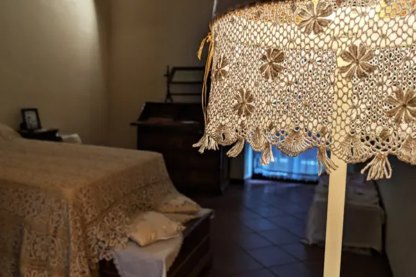 Twee museumzalen zijn volledig ingericht als oude woon- en slaapkamer waar prachtige tafelkleden, bedlinnen, gordijnen, lampenkappen en zijden kledingstukken te bewonderen zijn. Het voelt alsof je een oude schatkist opent!