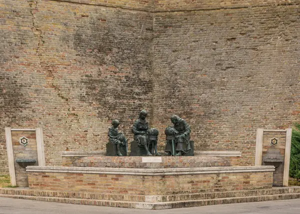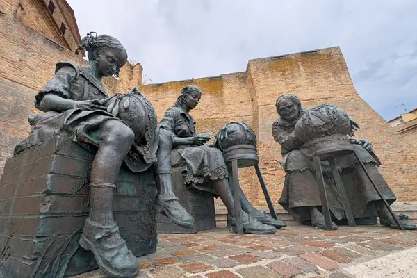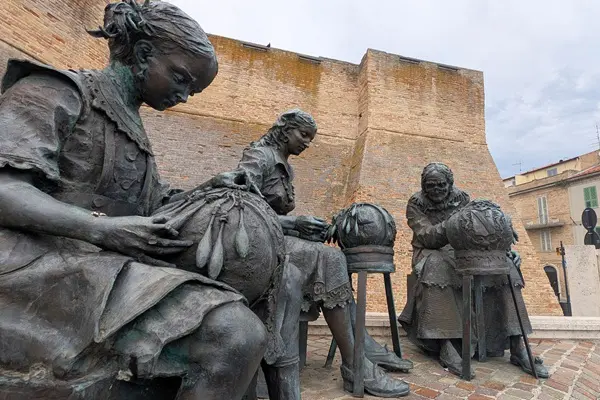 Al bij binnenkomst in Offida word je begroet door het ontroerende Monumento alle Merlettaie: drie gedetailleerde bronzen beelden van grootmoeder, moeder en dochter die samen aan het kantklossen zijn.