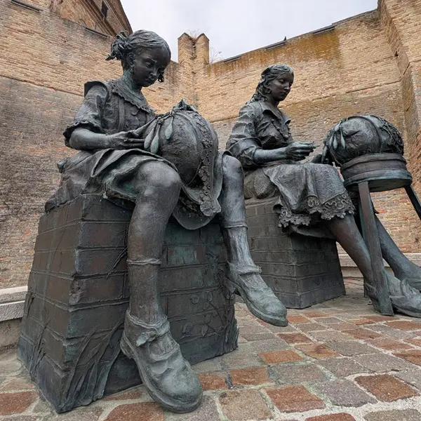 De lokale beeldhouder Aldo Sergiacomi maakte deze beelden in 1983 als eerbetoon aan de kunst die le merlettaie, de kantklosdames, over vele generaties verbindt. Kijk goed naar het beeld van het meisje; in de zak van haar jurk zit een piepkleine pop verstopt!