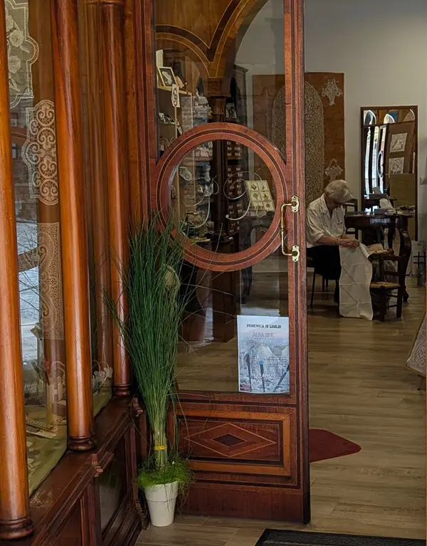Marisa heet me welkom: ‘Benvenuta nella nostra associazione!’ zegt ze als ik de winkel van de vereniging van de merlettaie binnenstap, aan het begin van de hoofdstraat Corso Serpente Aureo.