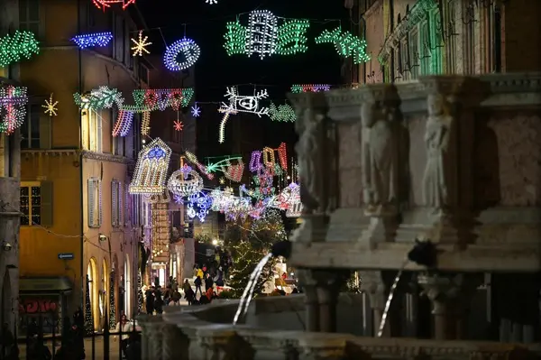 In Perugia schitteren dit jaar lochtkunstwerken naar ontwerp van Mimmo Paladino, die zijn gemaakt door MarianoLight uit Puglia.