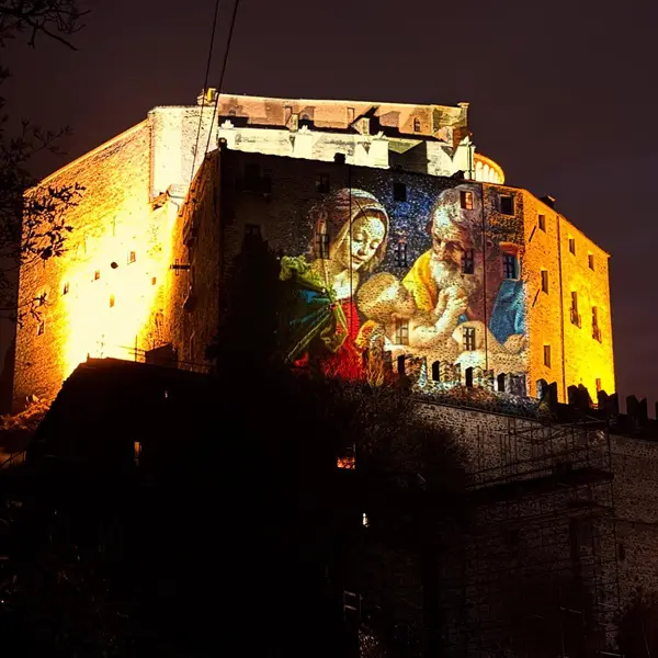 Op de gevel van de Sacra San Michele, niet ver van Turijn, zie je een kleurrijke projectie van de geboorte van Jezus.