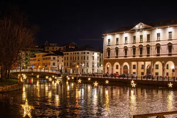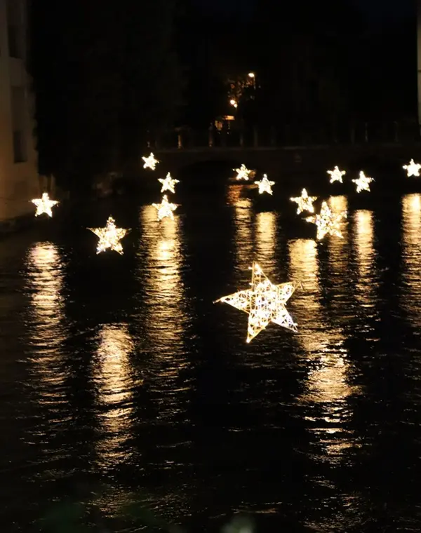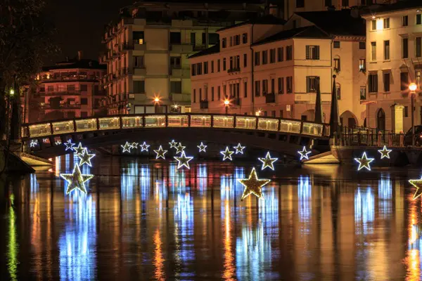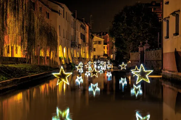 Treviso wordt in aanloop naar de kerstdagen verlicht door stralende sterren boven het water, simpel maar heel stijl- en sfeervol!
