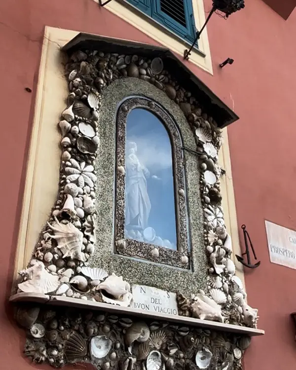 Sta bij de haven van Camogli even stil bij de Madonna del Buon Viaggio, een Mariabeeldje uit de zeventiende eeuw dat wordt omringd door schelpen die zeelieden uit alle hoeken van de wereld meebrachten van hun reizen om Maria om bescherming te vragen. Zo wordt Maria omringd door conchiglie uit Madagaskar, Tasmanië, Schotland, Sumatra en Guinee.