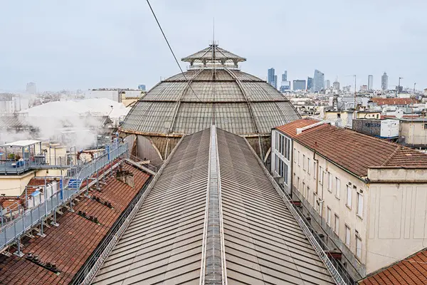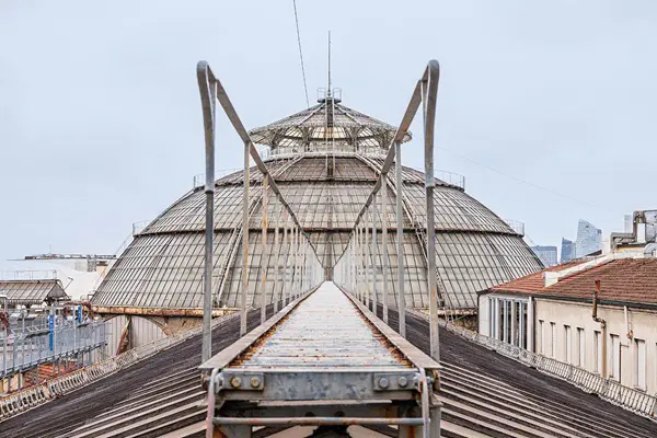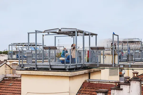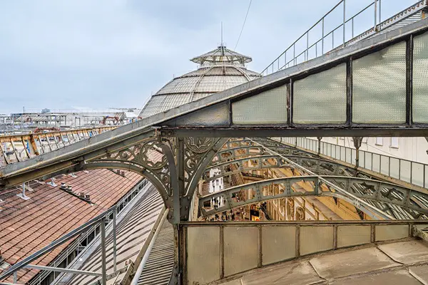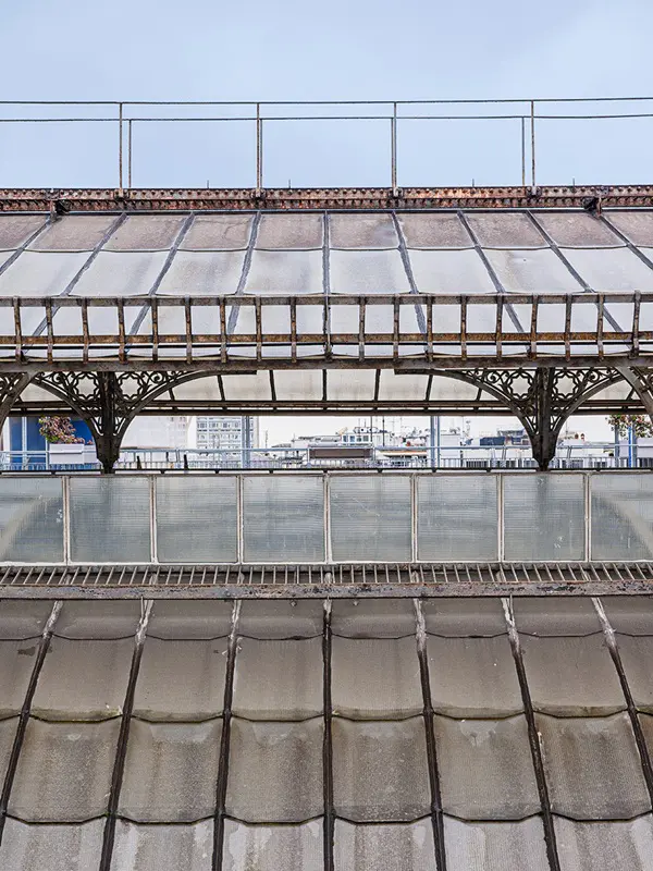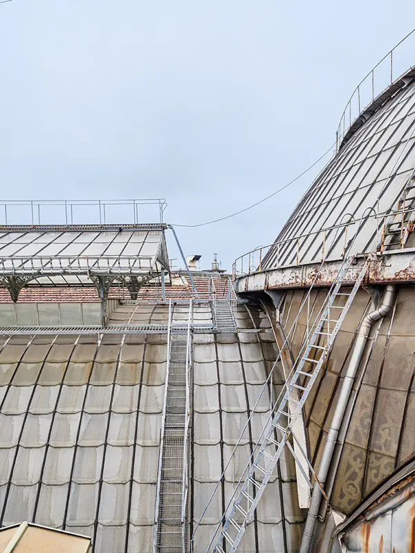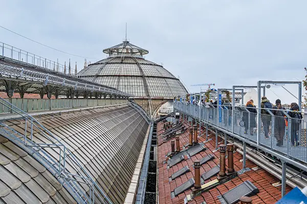 Het bijzondere aan deze route over het dak van de winkelgalerij is dat je een soort blik achter de schermen krijgt. Je kunt je enerzijds verwonderen over de chaos op de omliggende daken, waar schoorstenen, dakramen, verstopte terrassen en groen een mozaïek van kleuren vormen. Maar als je daar doorheen kijkt, kun je genieten van het uitzicht over de stad.